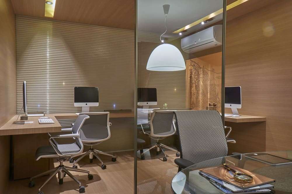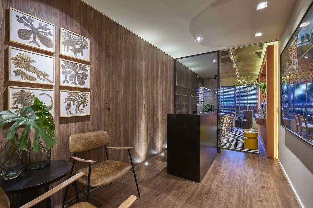 As instalações aparentes e a integração dos espaços fazem parte do conceito adotado. A laje nervurada assume destaque na sala principal e ainda contribui para aumentar a sensação de altura. Ao contrário do usual em ambientes pequenos, não foram adotadas cores claras, que deram lugar a tons sóbrios e madeira para criar elementos visuais aconchegantes. Os móveis planejados são a melhor opção para o aproveitamento do espaço, podendo ainda serem personalizados quanto à cor e detalhes, criando harmonia com os outros elementos de decoração. A iluminação é outro ponto importante. Além de pensar na eficiência energética, também deve-se levar em conta a temperatura da lâmpada, o cenário que ela cria e o seu potencial em alterar o humor das pessoas, assim como influenciar diretamente na produção do trabalho. Escritórios mais modernos já possuem diferentes intensidades e configurações de iluminação para cada hora do dia.