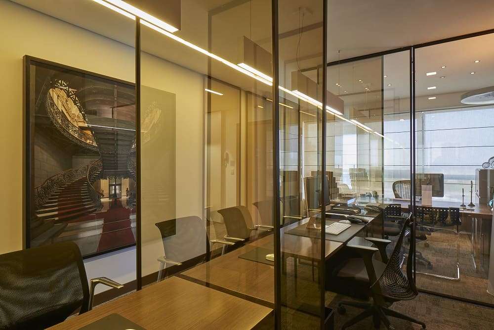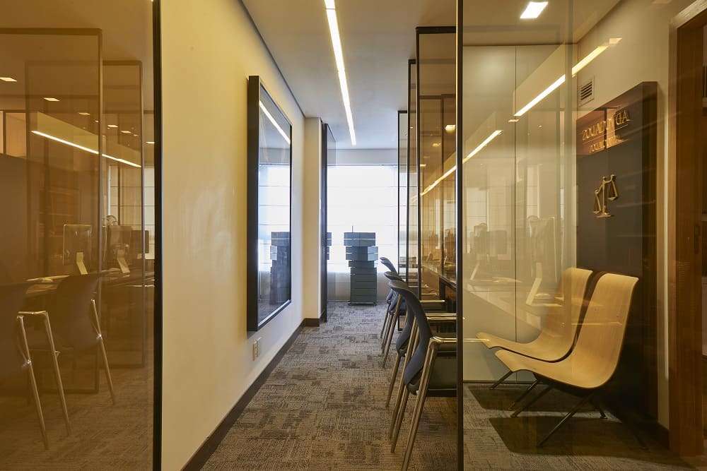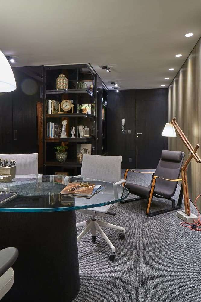 O espaço foi pensado para um jovem advogado, um assistente e uma secretária, ocupantes de uma sala de 33 m². A profundidade da sala foi reforçada com o traçado do piso definindo a área de circulação e a área de trabalho. A leveza dos vidros bronze espelhados, utilizados como divisórias, permite a integração visual, sem prejuízo para a iluminação natural, garante a privacidade necessária para cada função, mantêm a unidade do ambiente e cria um clima moderno sem excessos. Além disso, a escolha dos tons sóbrios confere ao escritório austeridade, e contrasta com as cadeiras que apresentam design contemporâneo e alta tecnologia.