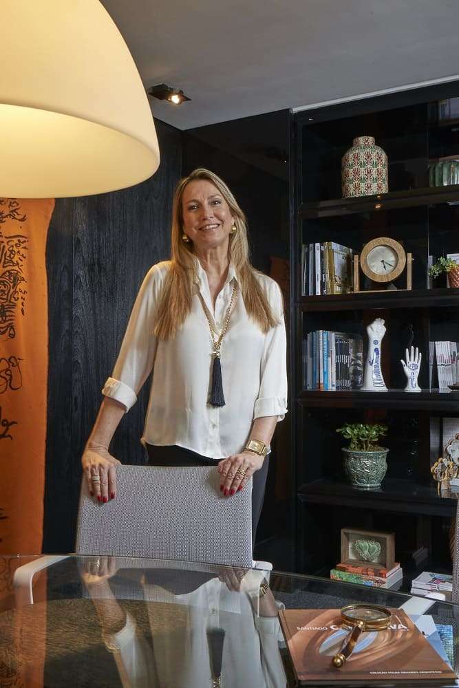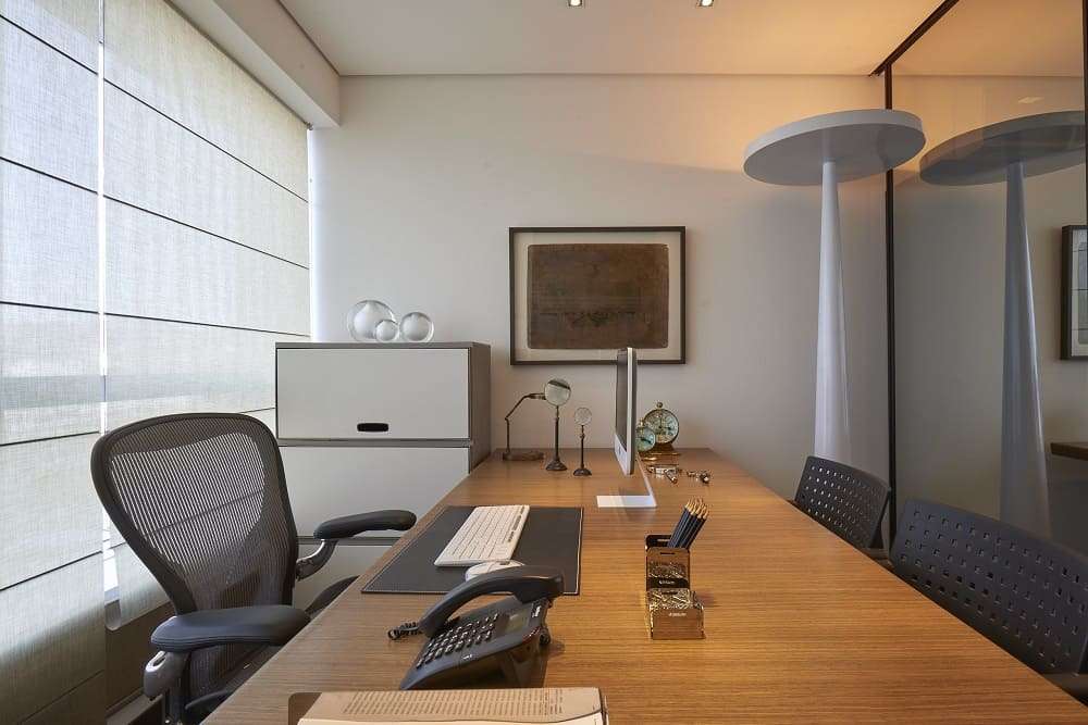 O ambiente foi criado para otimizar as funções da empresa, com a mesa do chefe à frente, com os interlocutores, e atrás uma caixa que abriga os colaboradores. Portas que funcionam como painéis é uma alternativa em salas pequenas, dando mais perspectiva ao ambiente. No projeto de Cícera, a grande estante, além de útil, possui duas portas que camuflam o lavabo e a copa.